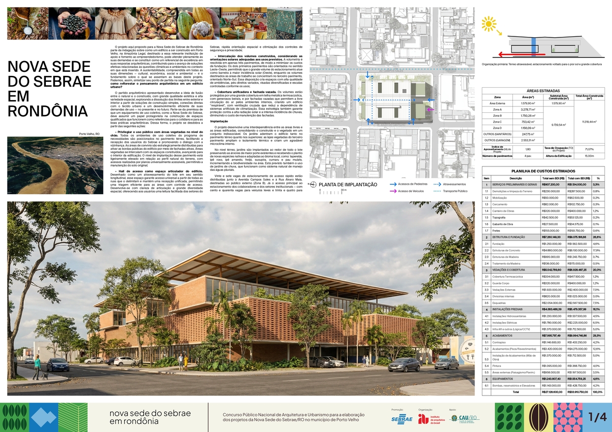 O projeto aqui proposto para a Nova Sede do Sebrae de Rondônia parte da indagação sobre como um edifício a ser construído em Porto Velho, na Amazônia Legal, destinado a essa relevante instituição de apoio e fomento ao empreendedorismo, pode atender plenamente às suas demandas e se constituir como um referencial de excelência em suas respostas arquitetônicas, contribuindo para o avanço de soluções efetivas relacionadas às questões climáticas e ambientais no contexto em que está inserido. A sustentabilidade, compreendida em todas as suas dimensões — cultural, econômica, social e ambiental — é o fundamento sobre o qual se assentam as bases deste projeto. Podemos, assim, sintetizar seu ponto de partida na seguinte pergunta: como reflorestar o pensamento arquitetônico em um edifício urbano?