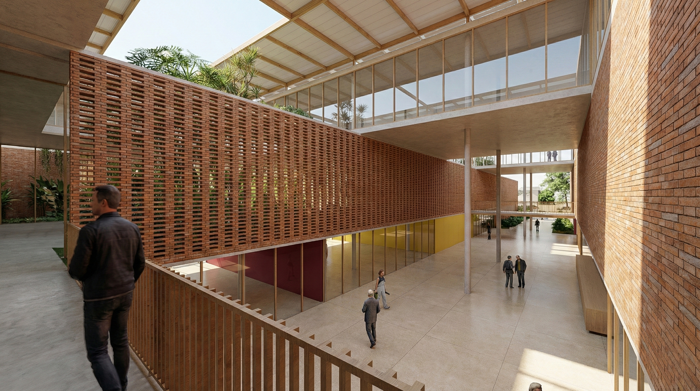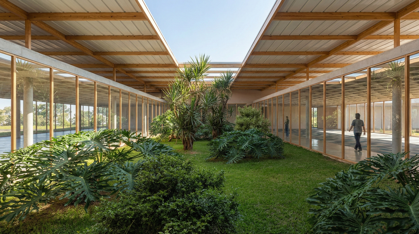 Essa disposição espacial, associada ao uso de fachadas ventiladas por elementos vazados, proporciona uma edificação com ampla ventilação natural, reduzindo a dependência de sistemas artificiais de climatização. Além disso, cria espaços com alta qualidade de ambiências arquitetônicas, ancoradas em soluções baseadas na natureza e dotadas de elevado desempenho ambiental.