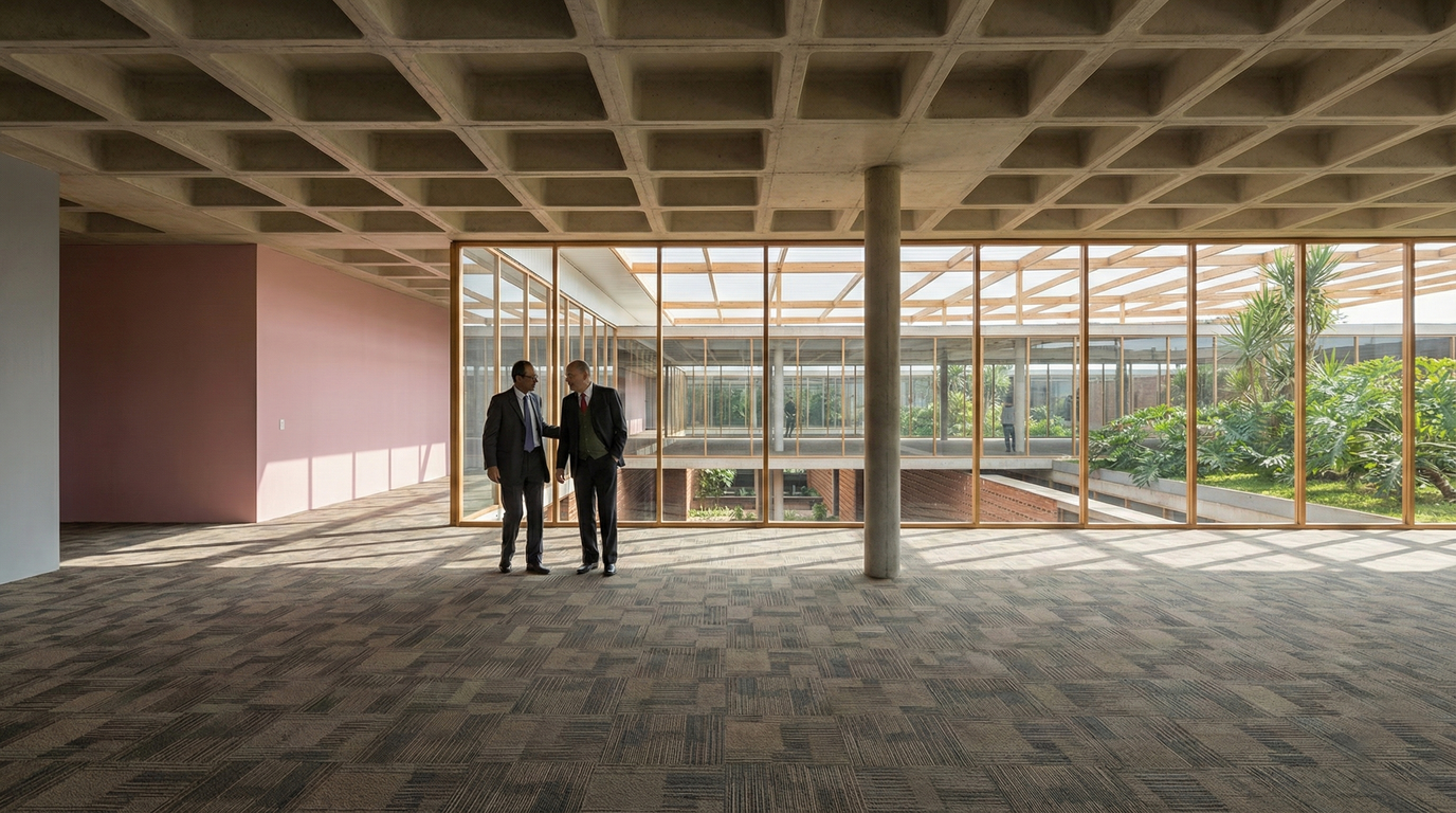 A disposição dos volumes edificados foi concebida de modo a otimizar a iluminação e a ventilação naturais, promovendo uma ocupação em que os limites entre exterior e interior se dissipam, permitindo que a natureza adentre o edifício. Uma grande cobertura organiza o conjunto, abrigando sob sua sombra os volumes construídos intercalados por vazios e jardins.