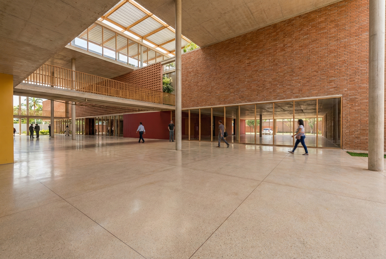 - Cobertura unificadora e fachada vazada. Os volumes estão protegidos por uma grande cobertura em telha metálica termoacústica, com generosos beirais, e por fachadas vazadas que permitem a livre circulação do ar pelos ambientes internos, criando um edifício “respirável”, com ventilação cruzada que reduz a dependência de sistemas artificiais de climatização. Essa estratégia também garante proteção contra a alta radiação solar e a intensa incidência de chuvas, diminuindo o custo de manutenção das fachadas.
